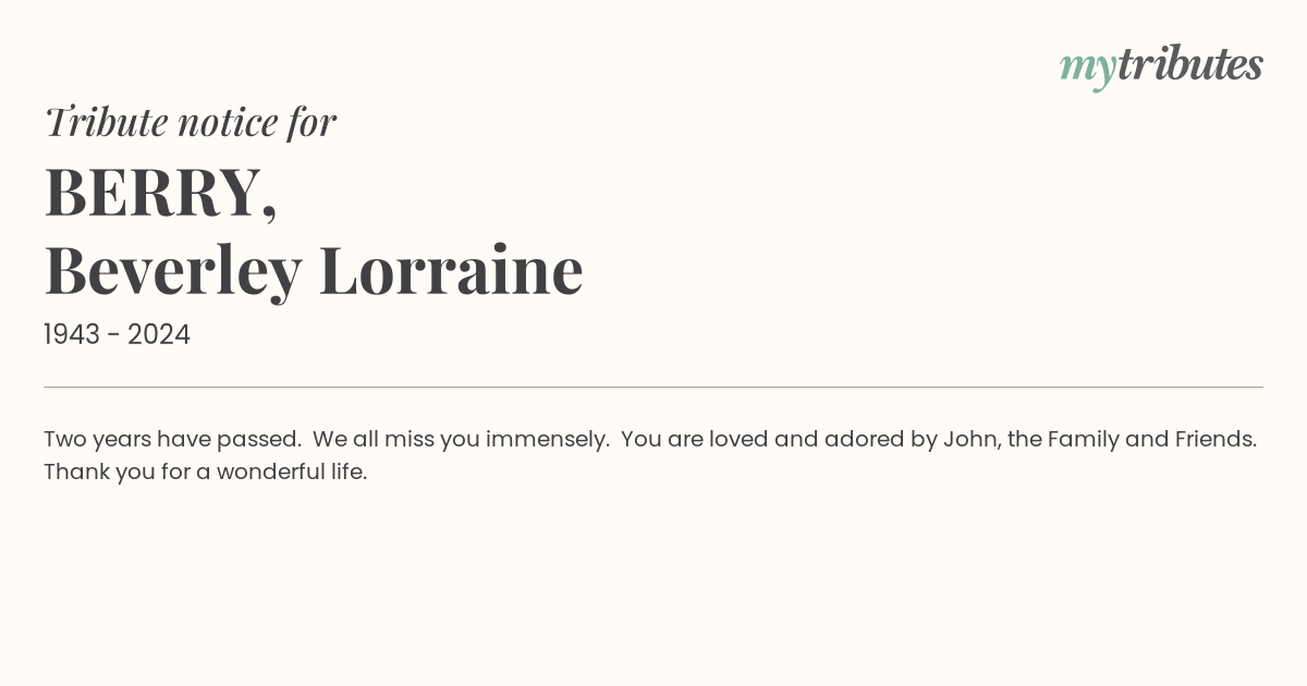 18°CTwo years have passed. We all miss you immensely. You are loved and adored by John, the Family and Friends. Thank you for a wonderful life.