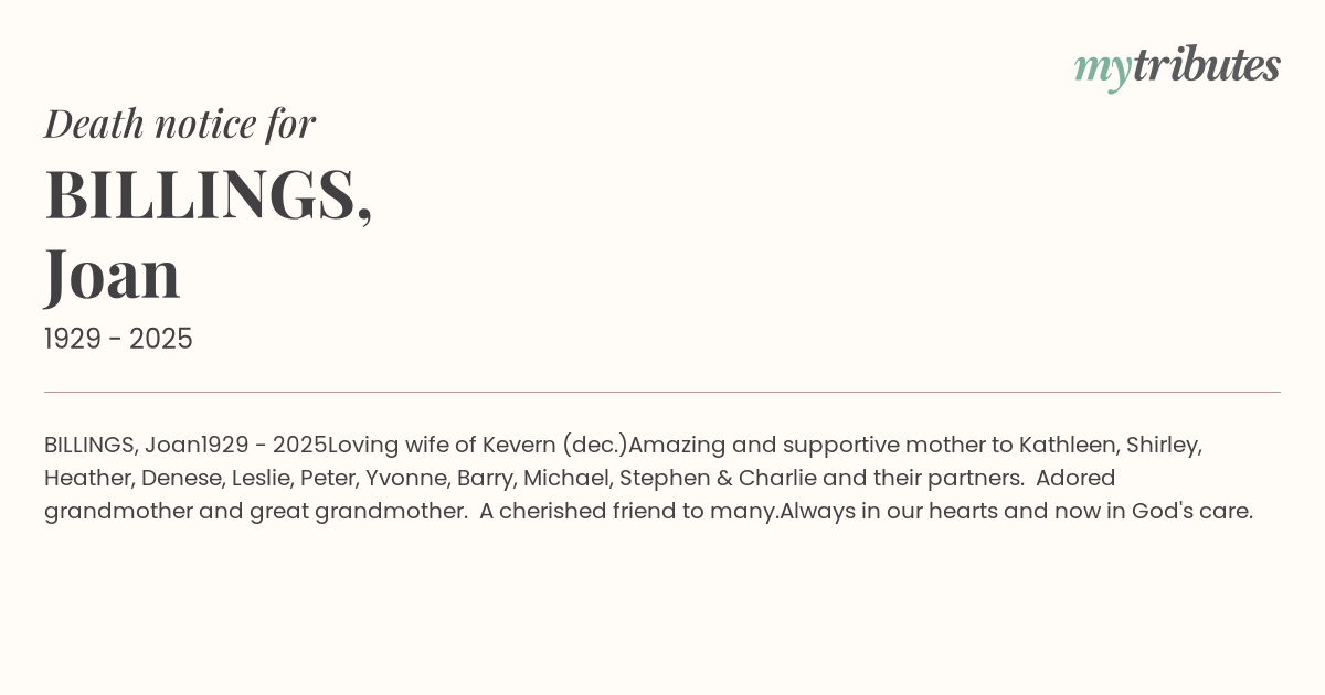 Amazing and supportive mother to Kathleen, Shirley, Heather, Denese, Leslie, Peter, Yvonne, Barry, Michael, Stephen & Charlie and their partners. Adored grandmother and great grandmother. A cherished friend to many.