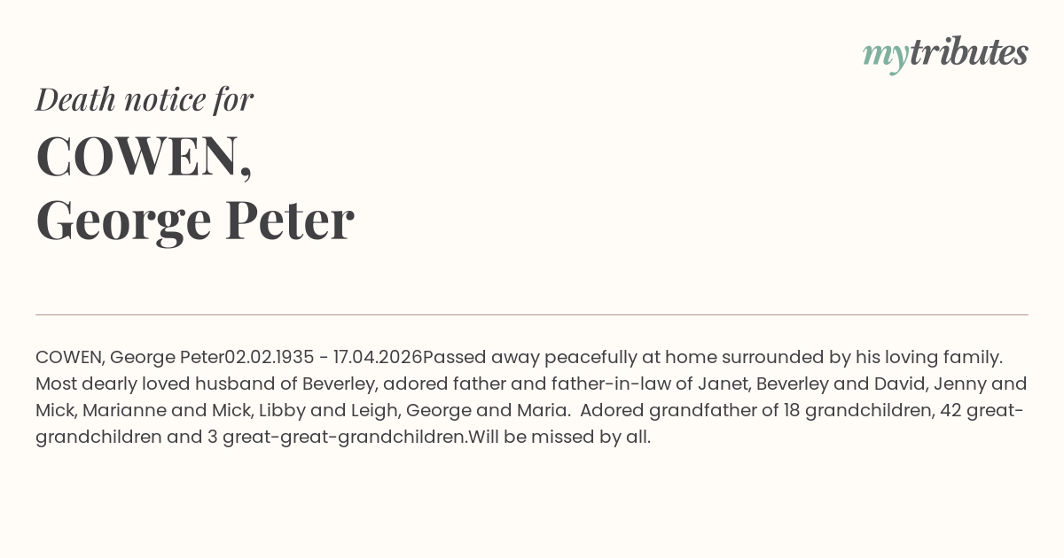 Passed away peacefully at home surrounded by his loving family. Most dearly loved husband of Beverley, adored father and father-in-law of Janet, Beverley and David, Jenny and Mick, Marianne and Mick, Libby and Leigh, George and Maria. Adored grandfather of 18 grandchildren, 42 great-grandchildren and 3 great-great-grandchildren.