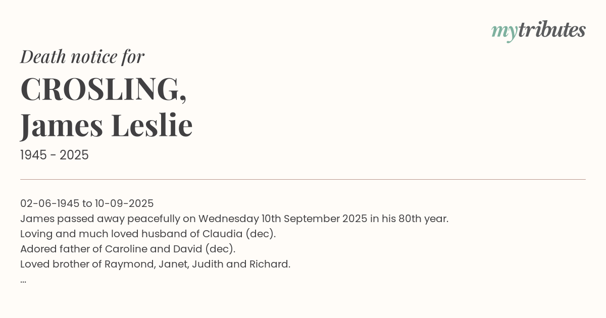 James passed away peacefully on Wednesday 10th September 2025 in his 80th year.