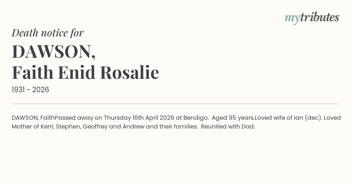 Passed away on Thursday 16th April 2026 at Bendigo. Aged 95 years.