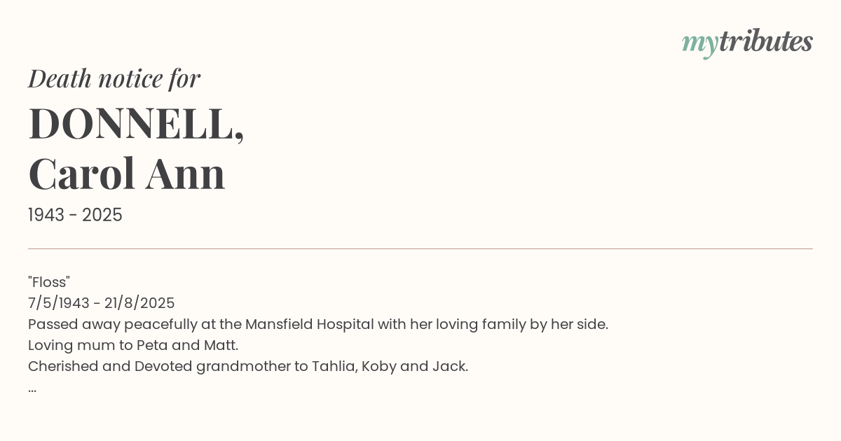 Passed away peacefully at the Mansfield Hospital with her loving family by her side.