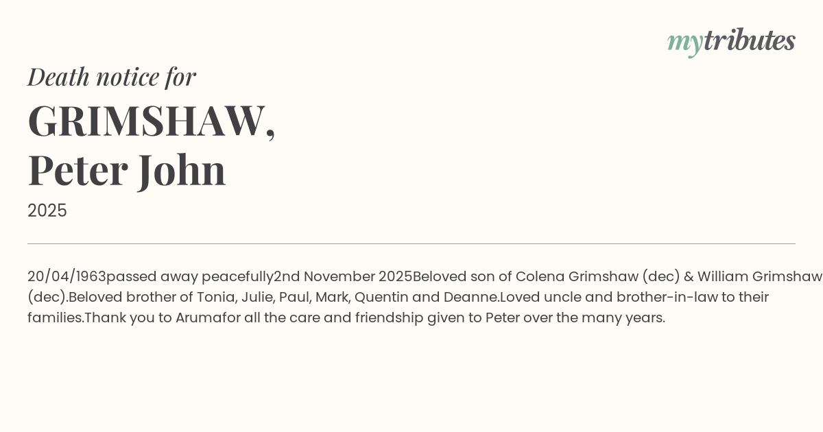 Beloved son of Colena Grimshaw (dec) & William Grimshaw (dec).