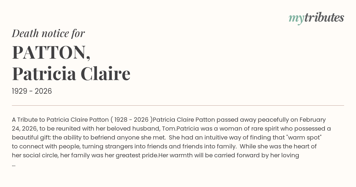 Patricia Claire Patton passed away peacefully on February 24, 2026, to be reunited with her beloved husband, Tom.