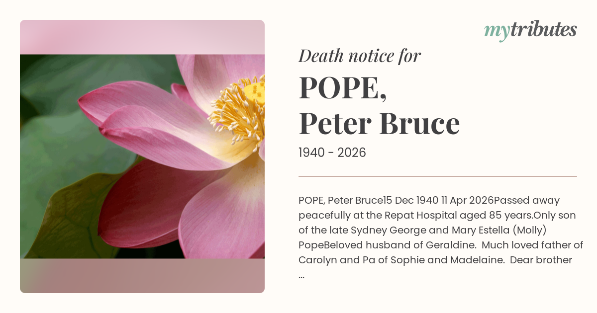 Only son of the late Sydney George and Mary Estella (Molly) Pope