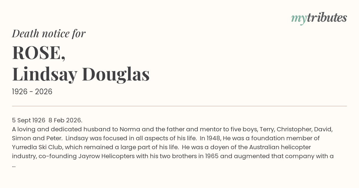 A loving and dedicated husband to Norma and the father and mentor to five boys, Terry, Christopher, David, Simon and Peter. Lindsay was focused in all aspects of his life. In 1948, He was a foundation member of Yurredla Ski Club, which remained a large part of his life. He was a doyen of the Australian helicopter industry, co-founding Jayrow Helicopters with his two brothers in 1965 and augmented that company with a vision for a gas turbine overhaul company in 1985. An intense and generous friend to those he respected, he will be missed by many who had the privilege of knowing him.