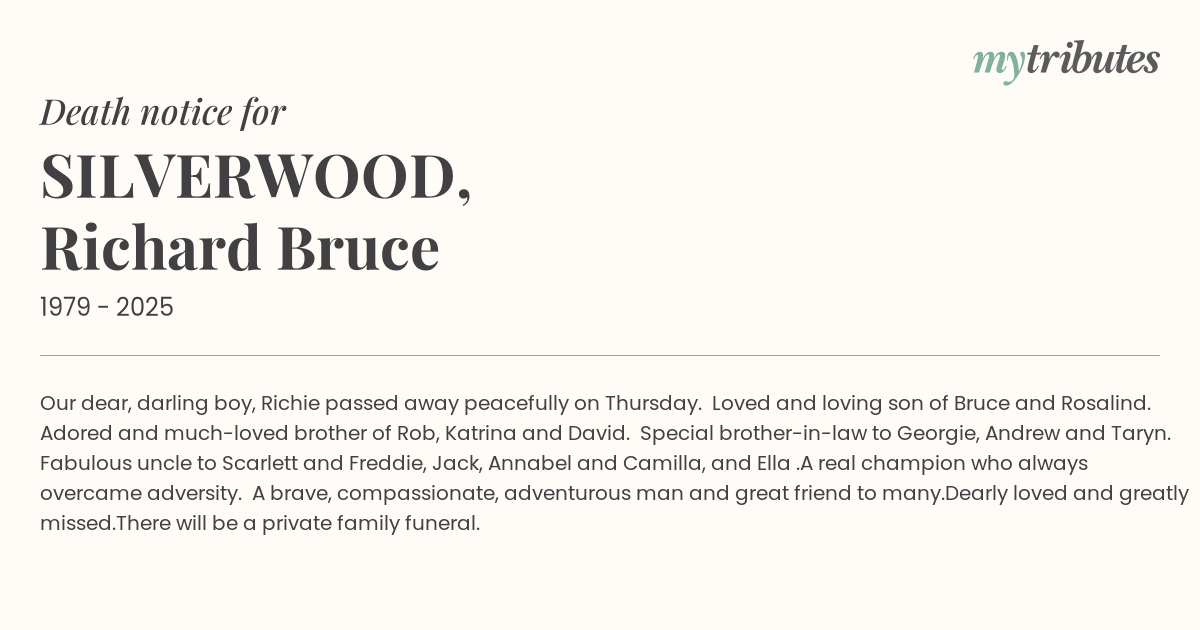 18°COur dear, darling boy, Richie passed away peacefully on Thursday. Loved and loving son of Bruce and Rosalind. Adored and much-loved brother of Rob, Katrina and David. Special brother-in-law to Georgie, Andrew and Taryn. Fabulous uncle to Scarlett and Freddie, Jack, Annabel and Camilla, and Ella .