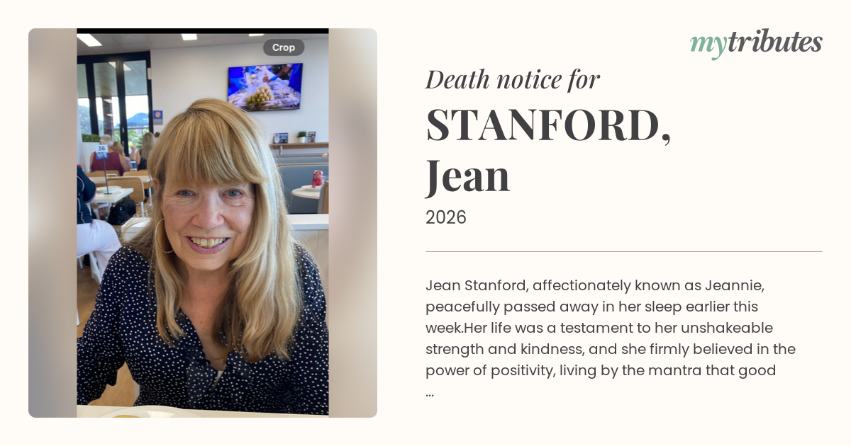 18°CJean Stanford, affectionately known as Jeannie, peacefully passed away in her sleep earlier this week.