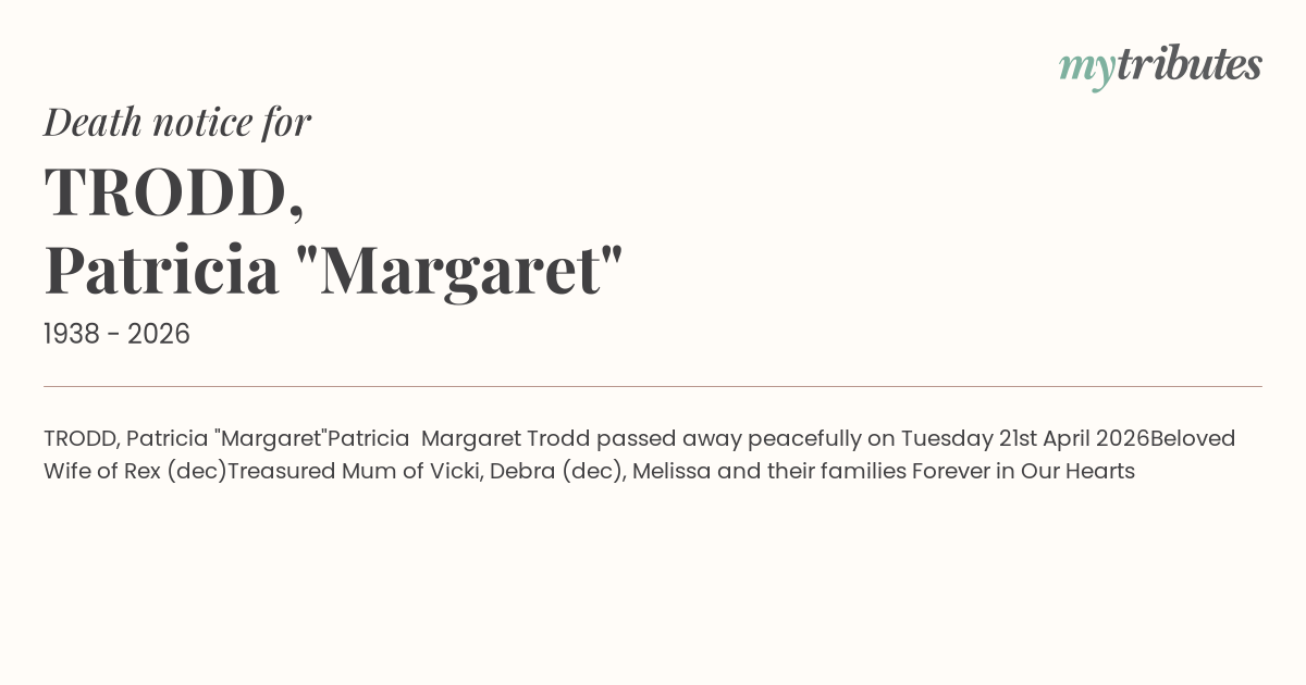 Patricia Margaret Trodd passed away peacefully on Tuesday 21st April 2026
