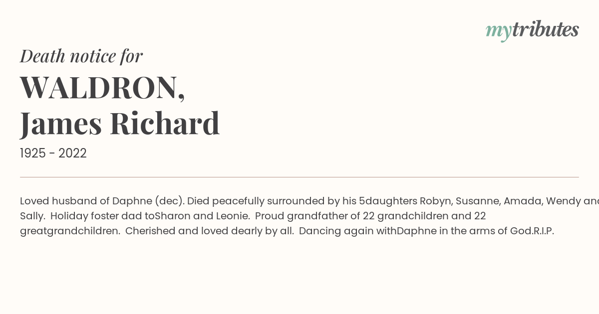 18°CLoved husband of Daphne (dec). Died peacefully surrounded by his 5