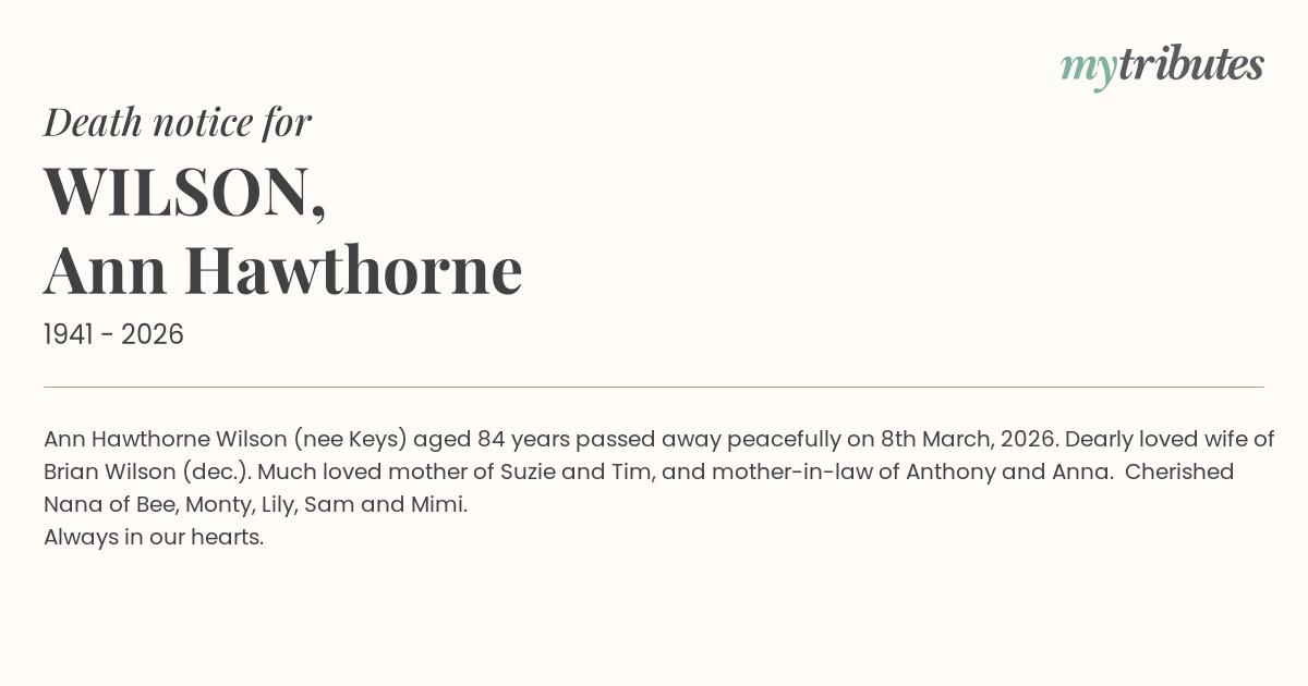 18°CAnn Hawthorne Wilson (nee Keys) aged 84 years passed away peacefully on 8th March, 2026. Dearly loved wife of Brian Wilson (dec.). Much loved mother of Suzie and Tim, and mother-in-law of Anthony and Anna. Cherished Nana of Bee, Monty, Lily, Sam and Mimi.