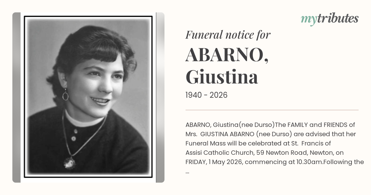 The FAMILY and FRIENDS of Mrs. GIUSTINA ABARNO (nee Durso) are advised that her Funeral Mass will be celebrated at St. Francis of Assisi Catholic Church, 59 Newton Road, Newton, on FRIDAY, 1 May 2026, commencing at 10.30am.