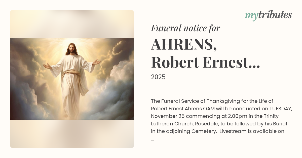 18°CThe Funeral Service of Thanksgiving for the Life of Robert Ernest Ahrens OAM will be conducted on TUESDAY, November 25 commencing at 2.00pm in the Trinity Lutheran Church, Rosedale, to be followed by his Burial in the adjoining Cemetery.