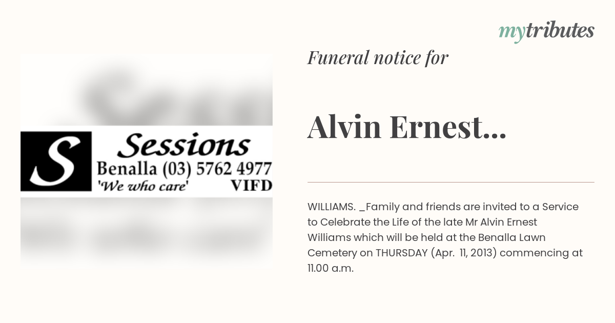 18°CWILLIAMS. _Family and friends are invited to a Service to Celebrate the Life of the late Mr Alvin Ernest Williams which will be held at the Benalla Lawn Cemetery on THURSDAY (Apr. 11, 2013) commencing at 11.00 a.m.