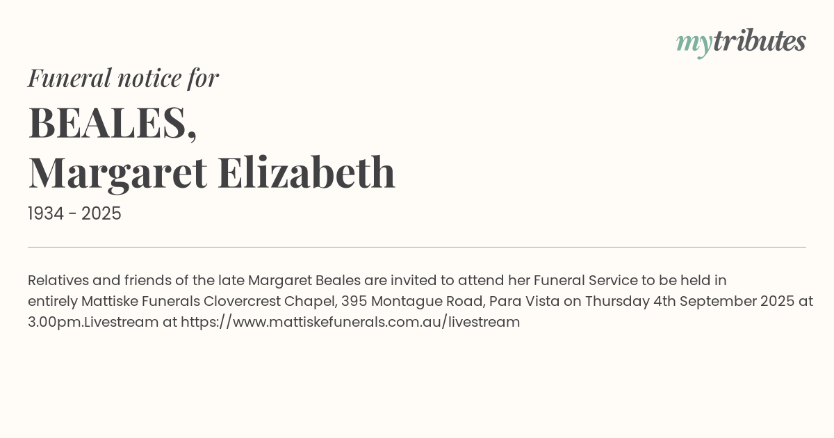 18°CRelatives and friends of the late Margaret Beales are invited to attend her Funeral Service to be held in entirely Mattiske Funerals Clovercrest Chapel, 395 Montague Road, Para Vista on Thursday 4th September 2025 at 3.00pm.