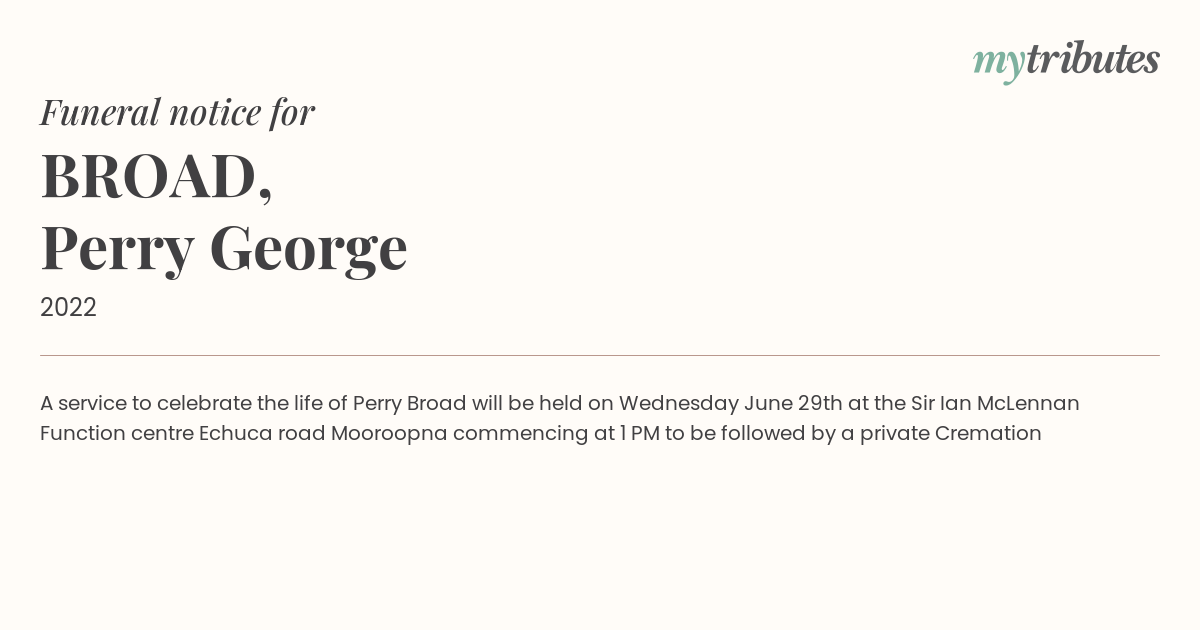 18°CA service to celebrate the life of Perry Broad will be held on Wednesday June 29th at the Sir Ian McLennan Function centre Echuca road Mooroopna commencing at 1 PM to be followed by a private Cremation
