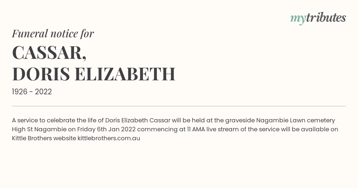 18°CA service to celebrate the life of Doris Elizabeth Cassar will be held at the graveside Nagambie Lawn cemetery High St Nagambie on Friday 6th Jan 2022 commencing at 11 AM