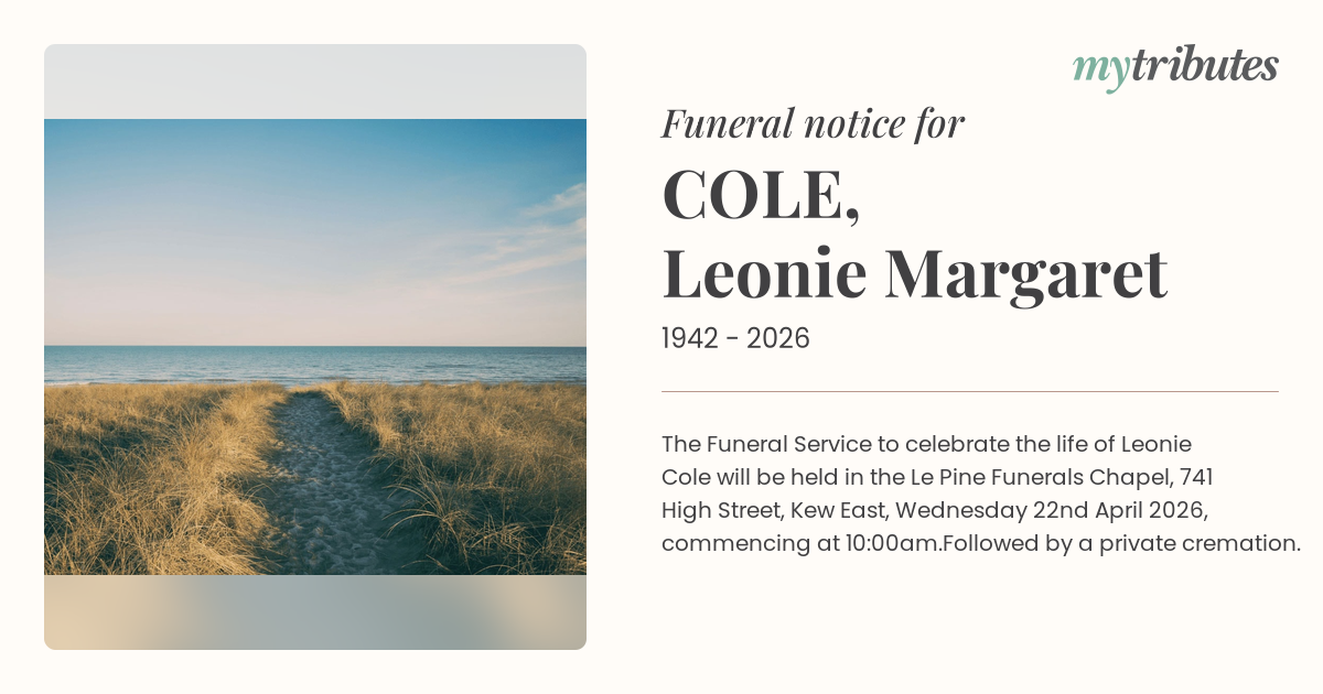 18°CThe Funeral Service to celebrate the life of Leonie Cole will be held in the Le Pine Funerals Chapel, 741 High Street, Kew East, Wednesday 22nd April 2026, commencing at 10:00am.