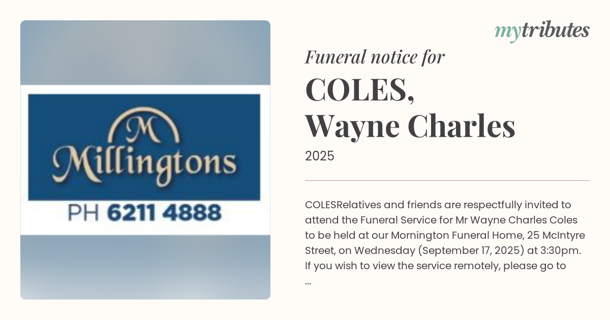 Relatives and friends are respectfully invited to attend the Funeral Service for Mr Wayne Charles Coles to be held at our Mornington Funeral Home, 25 McIntyre Street, on Wednesday (September 17, 2025) at 3:30pm. If you wish to view the service remotely, please go to millingtons.com.au click on tributes, and then select the livestream link.