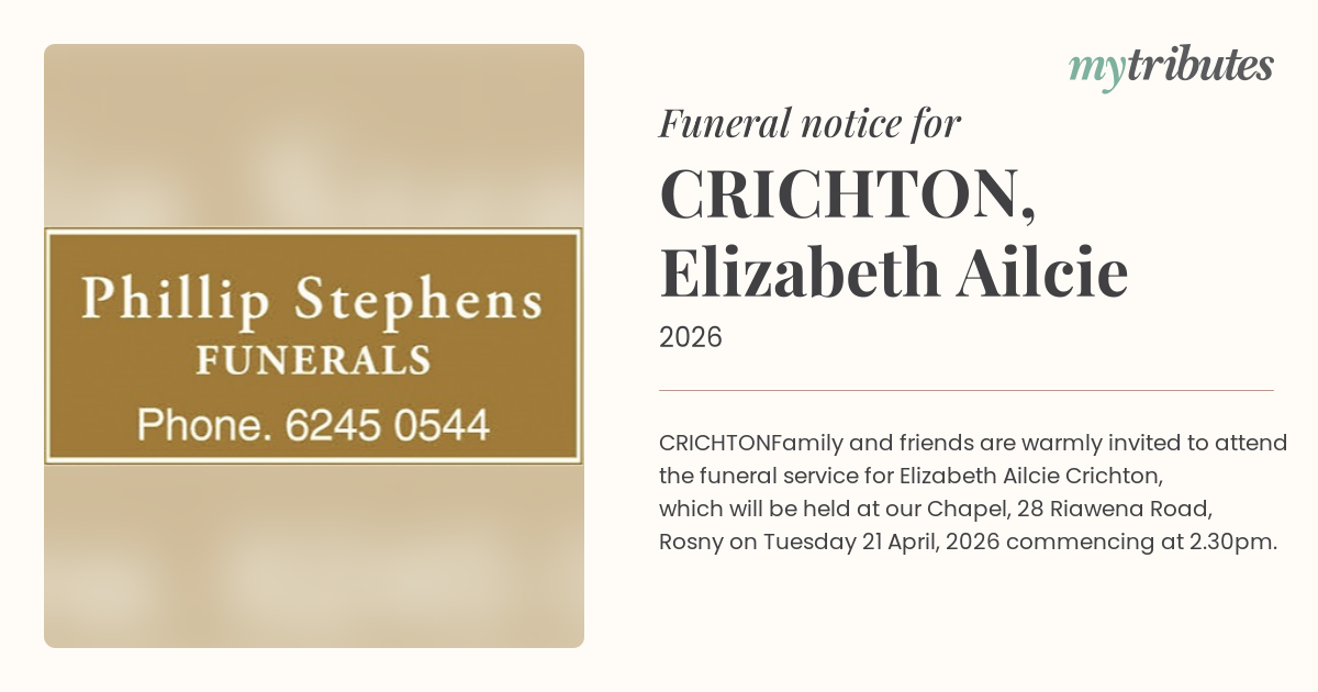 Family and friends are warmly invited to attend the funeral service for Elizabeth Ailcie Crichton, which will be held at our Chapel, 28 Riawena Road, Rosny on Tuesday 21 April, 2026 commencing at 2.30pm.