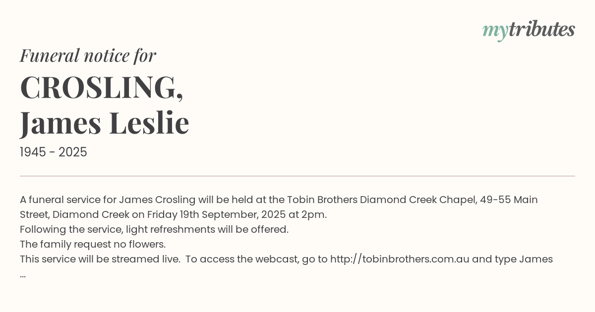 18°CA funeral service for James Crosling will be held at the Tobin Brothers Diamond Creek Chapel, 49-55 Main Street, Diamond Creek on Friday 19th September, 2025 at 2pm.