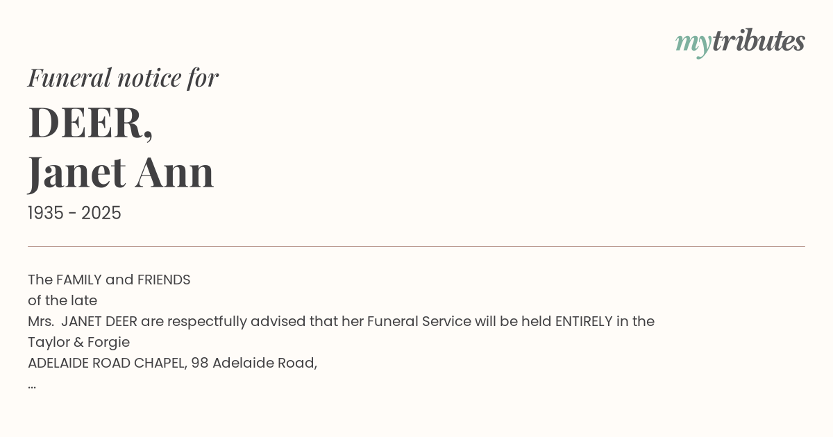 Mrs. JANET DEER are respectfully advised that her Funeral Service will be held ENTIRELY in the