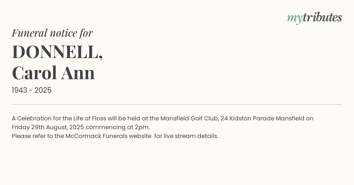 18°CA Celebration for the Life of Floss will be held at the Mansfield Golf Club, 24 Kidston Parade Mansfield on Friday 29th August, 2025 commencing at 2pm.