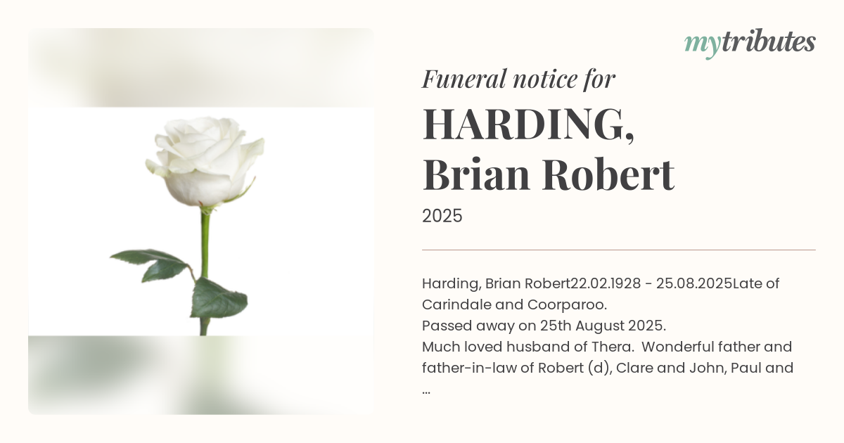 Funeral Mass for Brian will be held at Regina Caeli Catholic Church, 81 Waverley Road, Camp Hill, on Tuesday 2nd September, at 10 a.m., followed by burial at Toowong Cemetery.