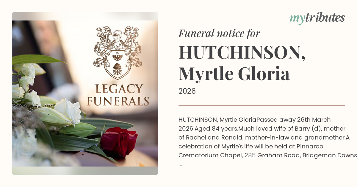 A celebration of Myrtle's life will be held at Pinnaroo Crematorium Chapel, 285 Graham Road, Bridgeman Downs, on Thursday 2nd April 2026, at 12.30 p.m.