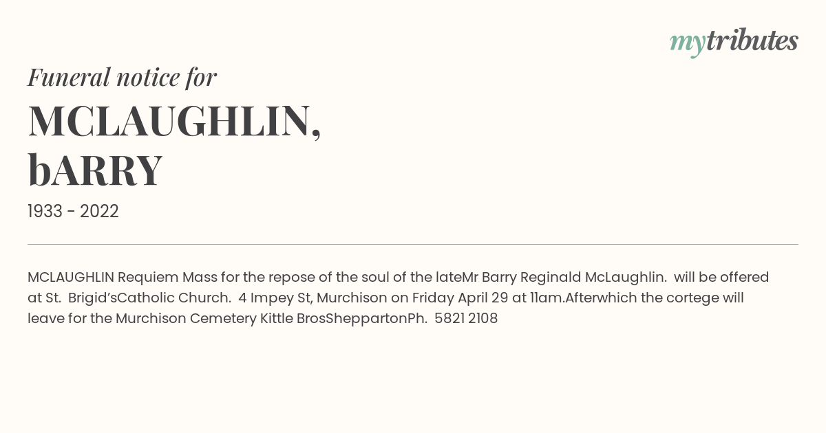 Mr Barry Reginald McLaughlin. will be offered at St. Brigid’s