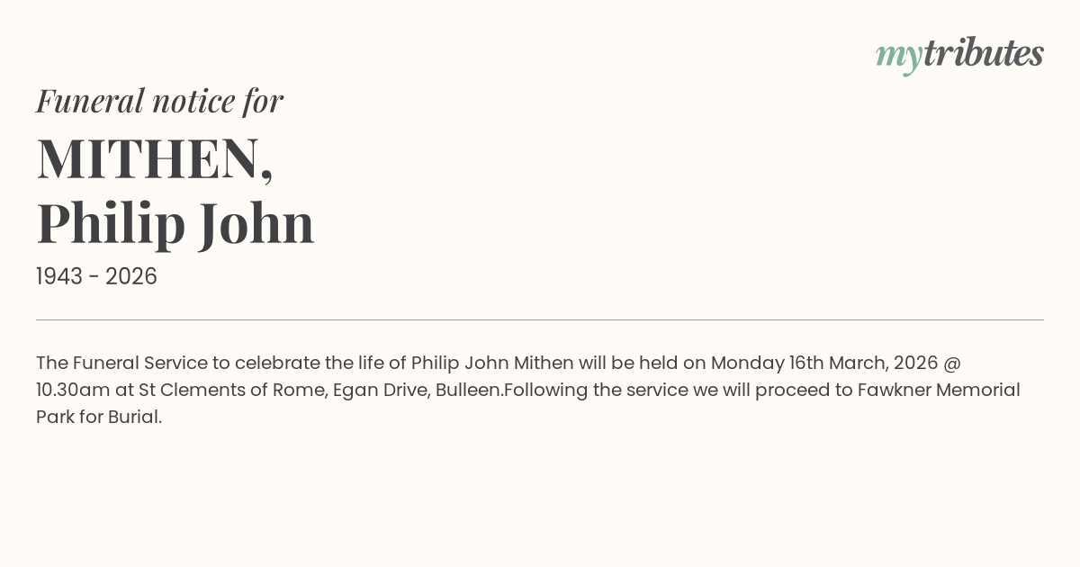 18°CThe Funeral Service to celebrate the life of Philip John Mithen will be held on Monday 16th March, 2026 @ 10.30am at St Clements of Rome, Egan Drive, Bulleen.