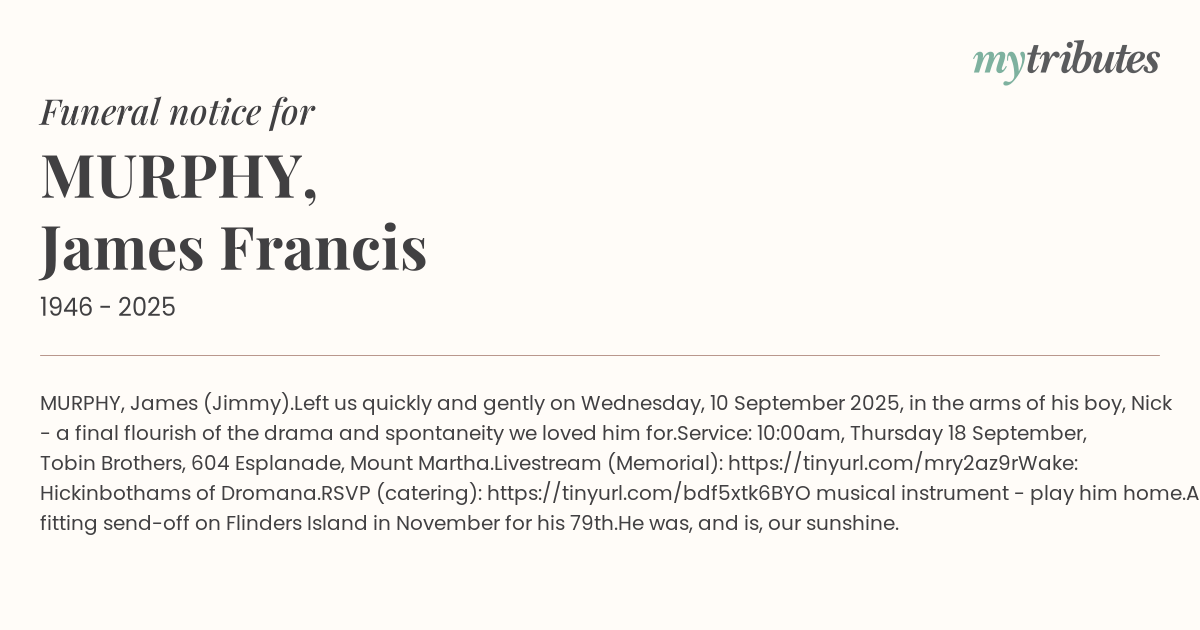 Left us quickly and gently on Wednesday, 10 September 2025, in the arms of his boy, Nick - a final flourish of the drama and spontaneity we loved him for.