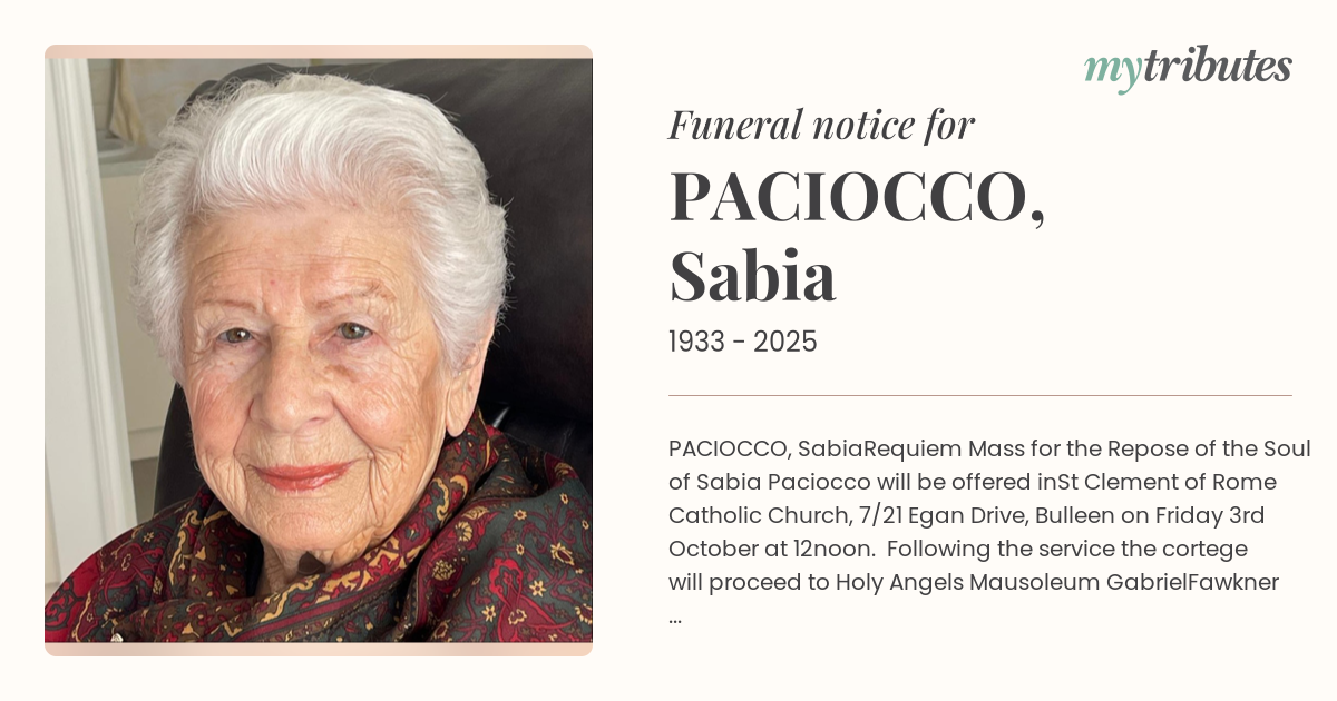 Requiem Mass for the Repose of the Soul of Sabia Paciocco will be offered in