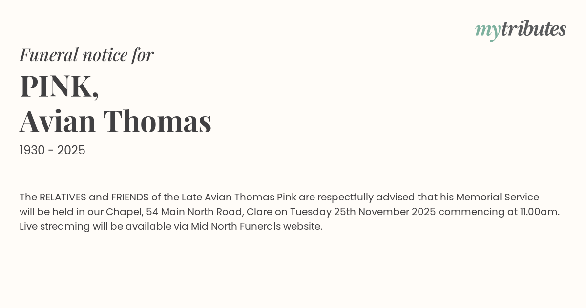 18°CThe RELATIVES and FRIENDS of the Late Avian Thomas Pink are respectfully advised that his Memorial Service will be held in our Chapel, 54 Main North Road, Clare on Tuesday 25th November 2025 commencing at 11.00am.