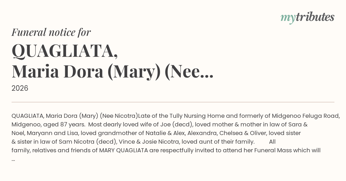 All family, relatives and friends of MARY QUAGLIATA are respectfully invited to attend her Funeral Mass which will be celebrated on SATURDAY MORNING