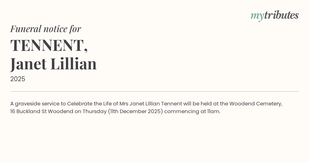 18°CA graveside service to Celebrate the Life of Mrs Janet Lillian Tennent will be held at the Woodend Cemetery, 16 Buckland St Woodend on Thursday (11th December 2025) commencing at 11am.