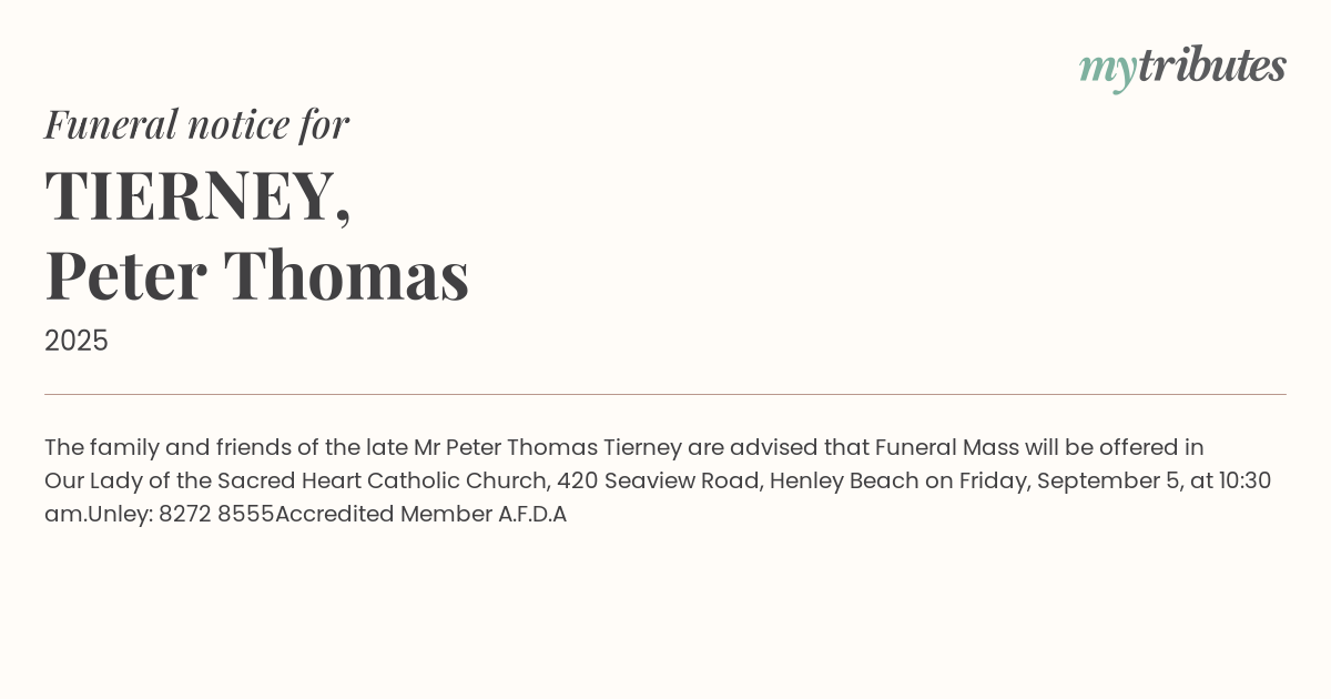 18°CThe family and friends of the late Mr Peter Thomas Tierney are advised that Funeral Mass will be offered in Our Lady of the Sacred Heart Catholic Church, 420 Seaview Road, Henley Beach on Friday, September 5, at 10:30 am.