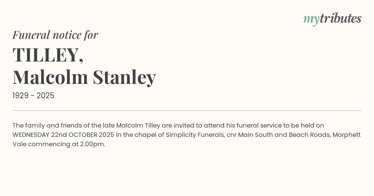 18°CThe family and friends of the late Malcolm Tilley are invited to attend his funeral service to be held on WEDNESDAY 22nd OCTOBER 2025 in the chapel of Simplicity Funerals, cnr Main South and Beach Roads, Morphett Vale commencing at 2.00pm.