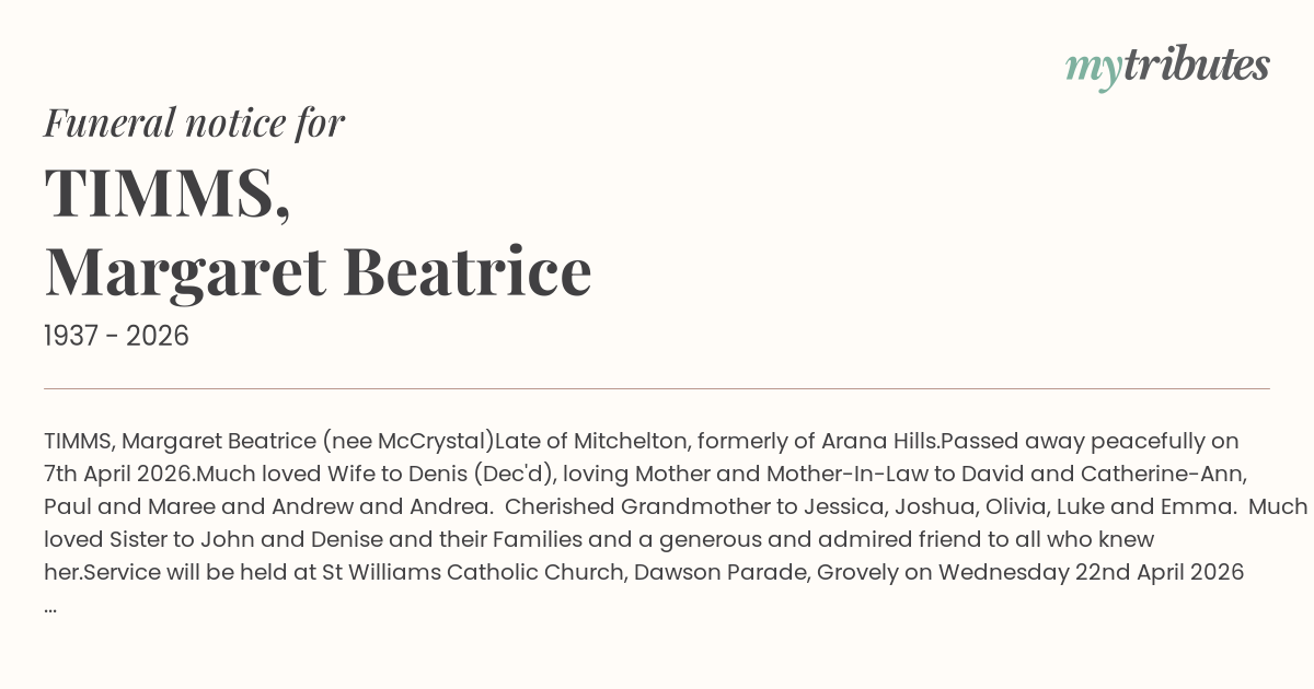 Service will be held at St Williams Catholic Church, Dawson Parade, Grovely on Wednesday 22nd April 2026 at 10:00am