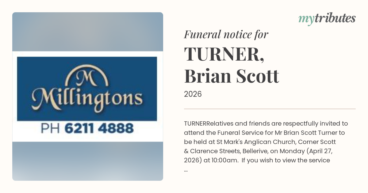 Relatives and friends are respectfully invited to attend the Funeral Service for Mr Brian Scott Turner to be held at St Mark's Anglican Church, Corner Scott & Clarence Streets, Bellerive, on Monday (April 27, 2026) at 10:00am. If you wish to view the service remotely, please go to millingtons.com.au/tributes/ click on Brian's profile, and then select the livestream link.