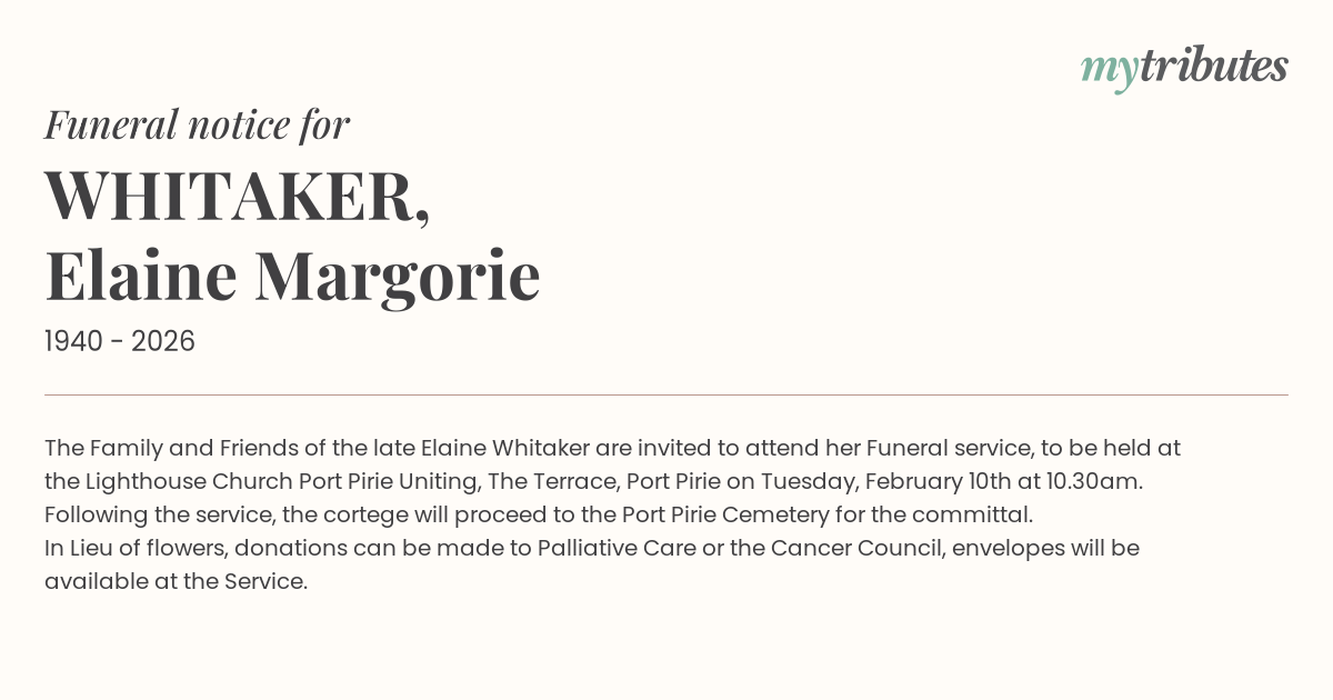 18°CThe Family and Friends of the late Elaine Whitaker are invited to attend her Funeral service, to be held at the Lighthouse Church Port Pirie Uniting, The Terrace, Port Pirie on Tuesday, February 10th at 10.30am.