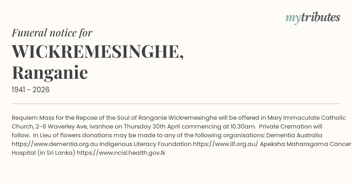 18°CRequiem Mass for the Repose of the Soul of Ranganie Wickremesinghe will be offered in Mary Immaculate Catholic Church, 2-6 Waverley Ave, Ivanhoe on Thursday 30th April commencing at 10.30am.