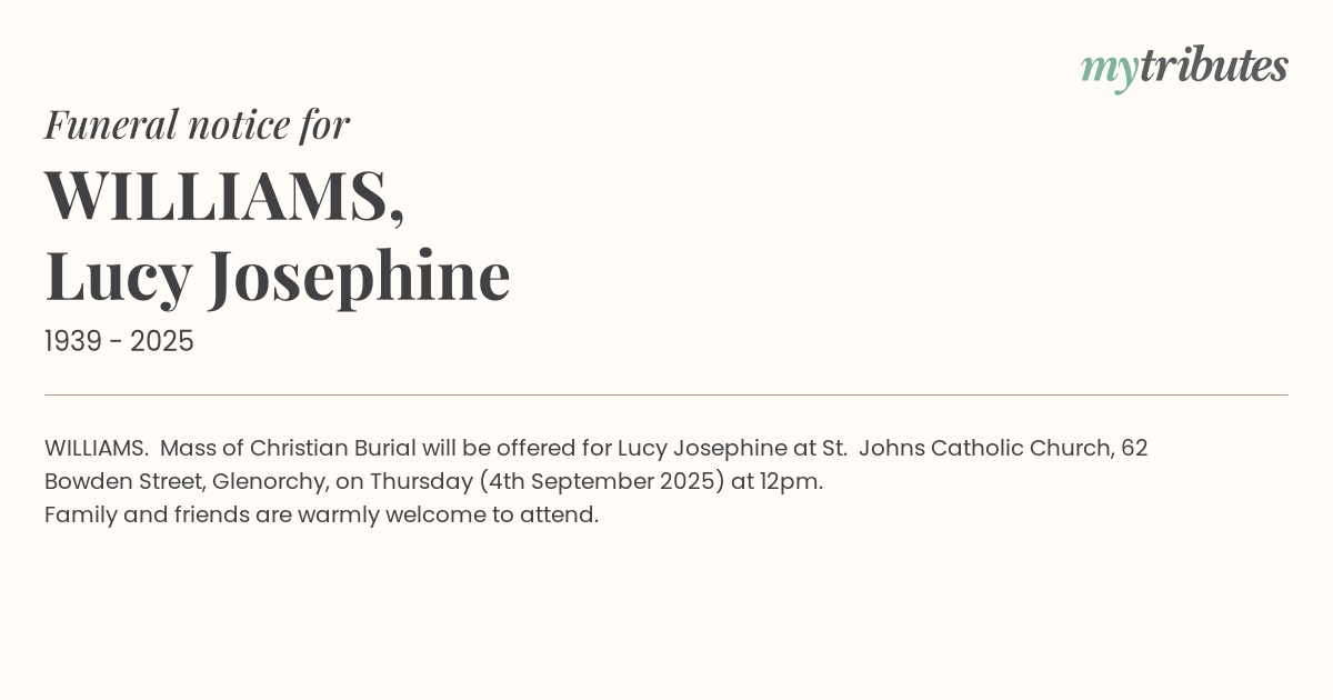 18°CWILLIAMS. Mass of Christian Burial will be offered for Lucy Josephine at St. John’s Catholic Church, 62 Bowden Street, Glenorchy, on Thursday (4th September 2025) at 12pm.