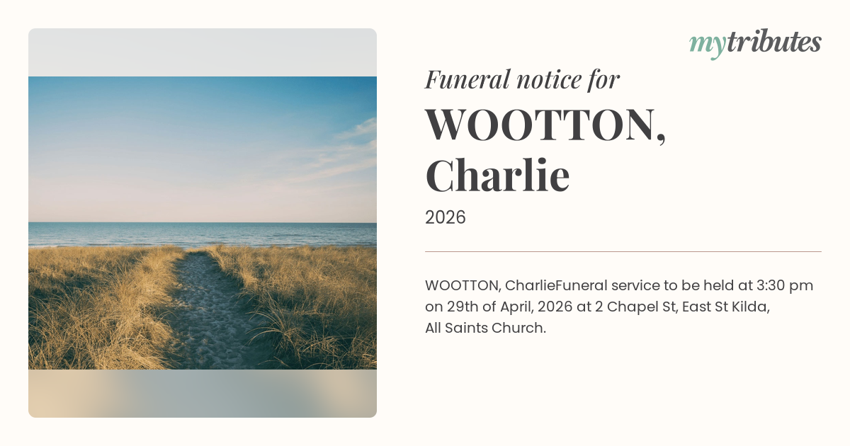 Funeral service to be held at 3:30 pm on 29th of April, 2026 at 2 Chapel St, East St Kilda, All Saints Church.